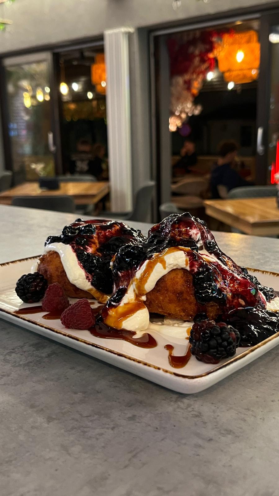 • Papanașii cu dulceață de afine și smântână – un clasic românesc care nu dă greș niciodată. Dulcele și acrișorul se întâlnesc într-un echilibru perfect.